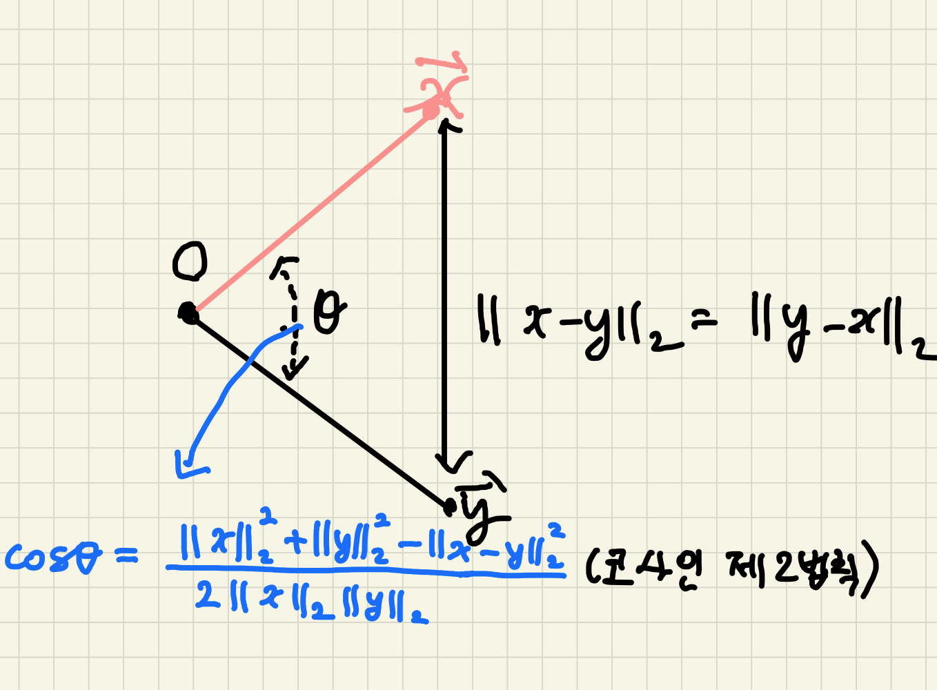 정사영을 통해 나온 값에는 cos theta가 포함되어있으므로, 내적은 두 벡터의 벡터 유사도를 측정할 때 사용할 수 있습니다.