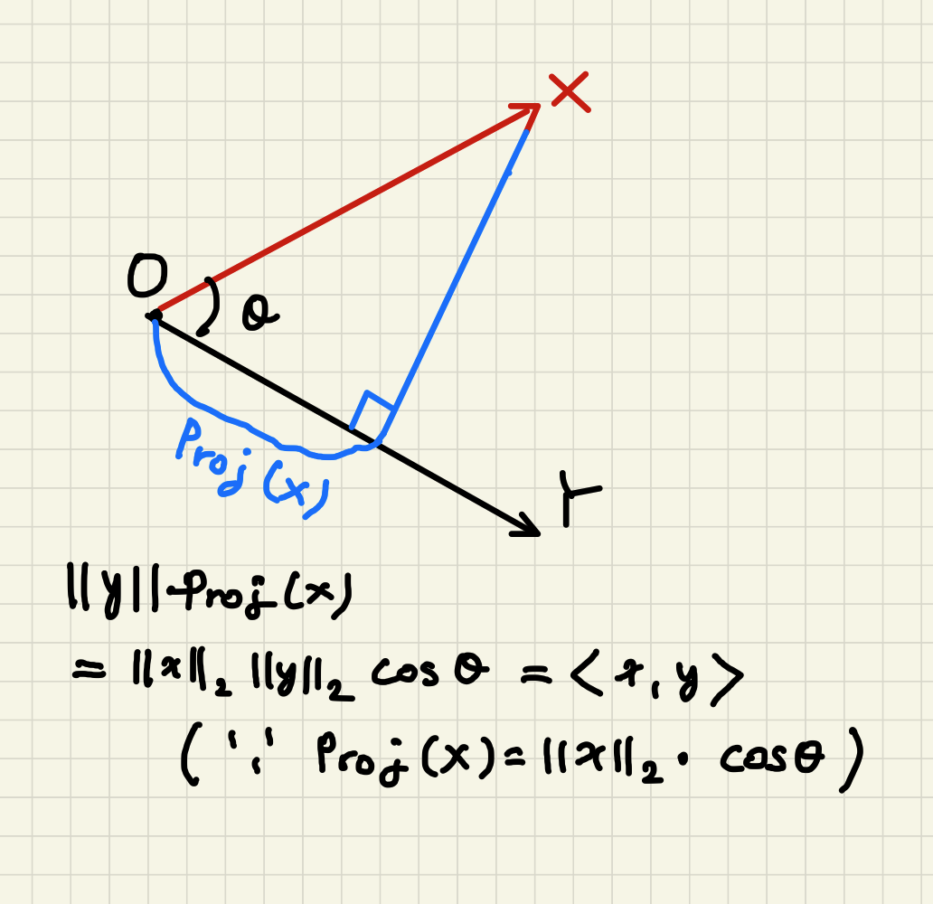 내적은 정사영(orthogonal projection)된 벡터 x의 길이를 벡터y의 길이만큼 곱해준 값입니다.