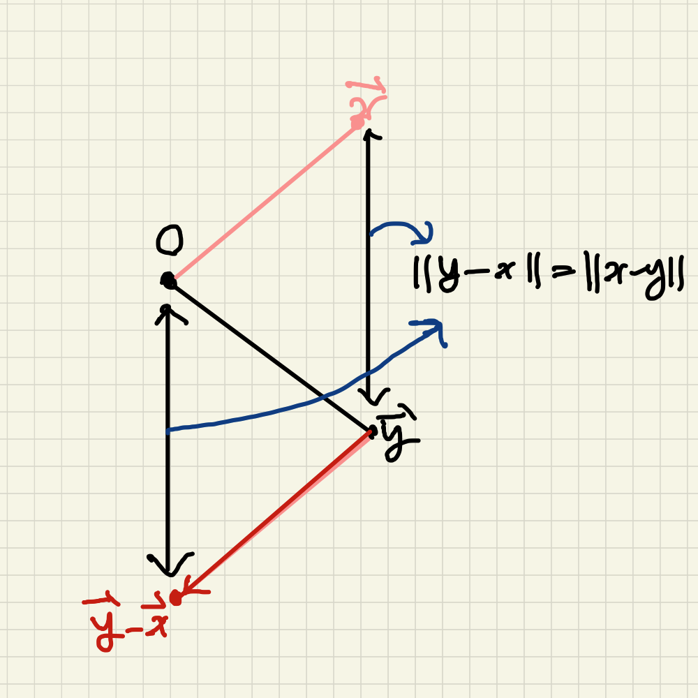 벡터의 거리는 벡터의 뺄셈 연산을 통해 구할 수 있습니다. 아래 그림을 보면 x와 y 사이의 거리를 구할 때, y 에서 x를 빼줘서 계산하는 것을 볼 수 있습니다.